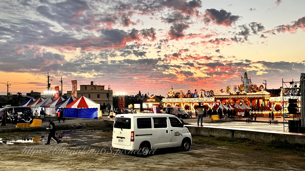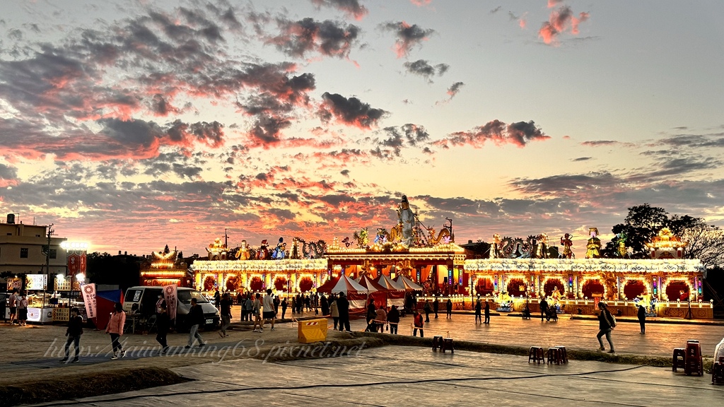 醮壇是因為地方宮廟等建築物落成啟用舉行作醮才會搭設,醮壇本已屬難得一見;2024年11月24日傍晚出現火燒雲剛好位於觀音壇背後,讓原本美麗的觀音壇顯得更加五彩繽紛。(↑)