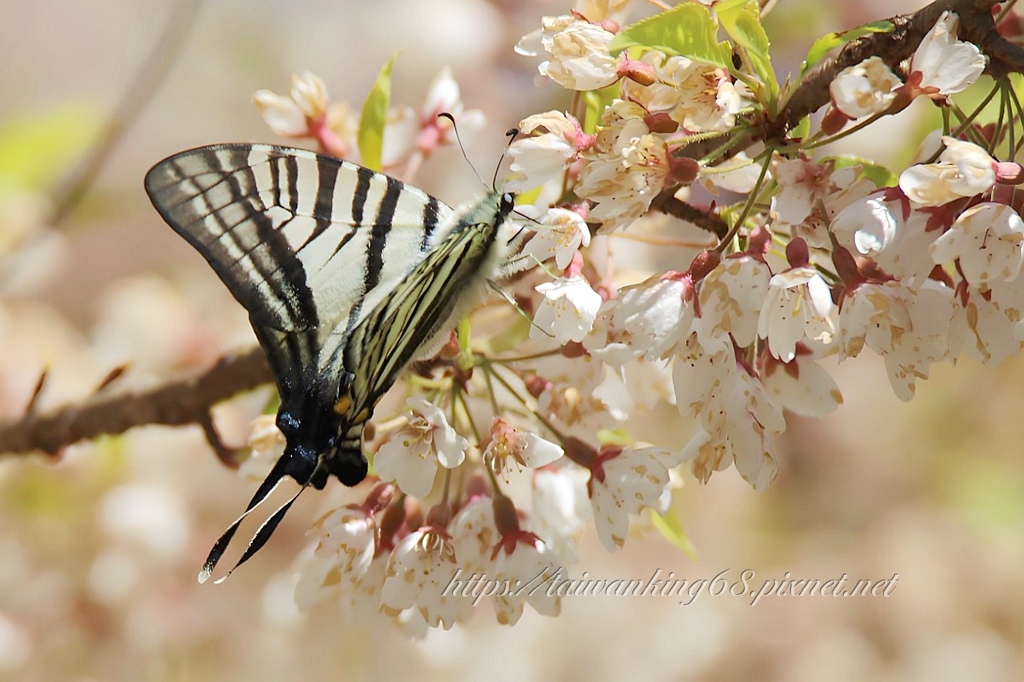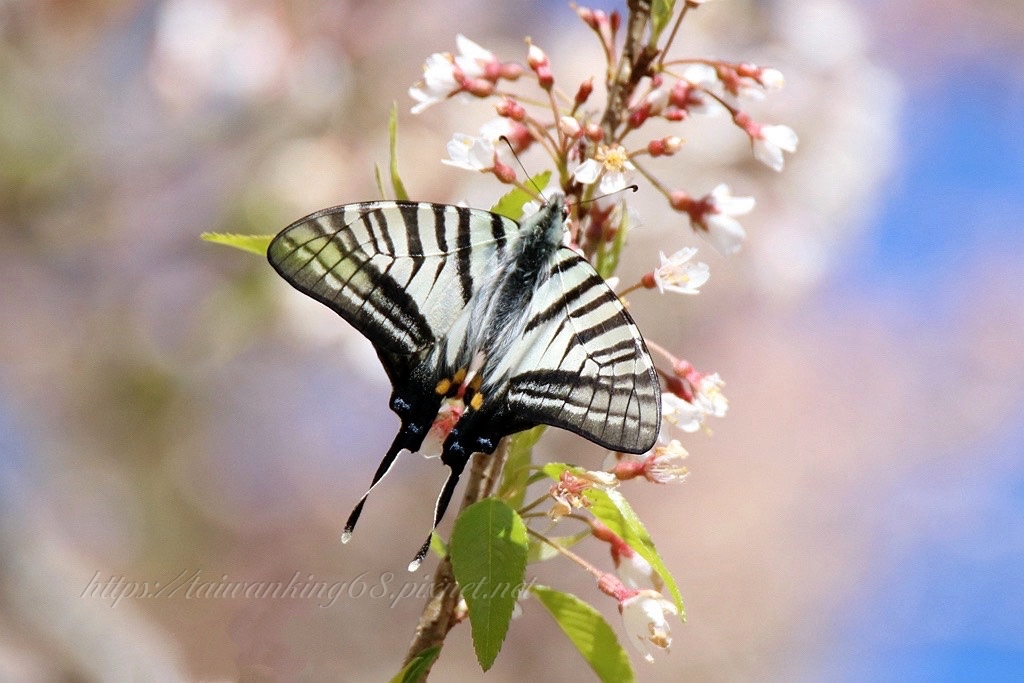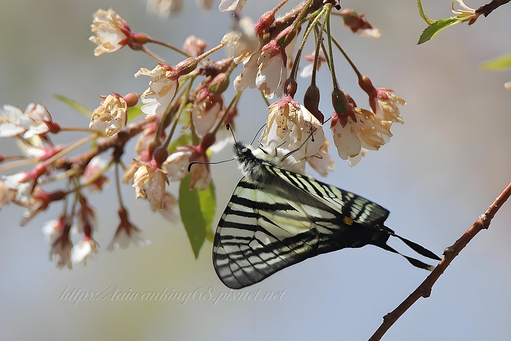 這是我第一次看到昇天鳳蝶,發現牠於大雪山遊客中心前的霧社櫻(↑)