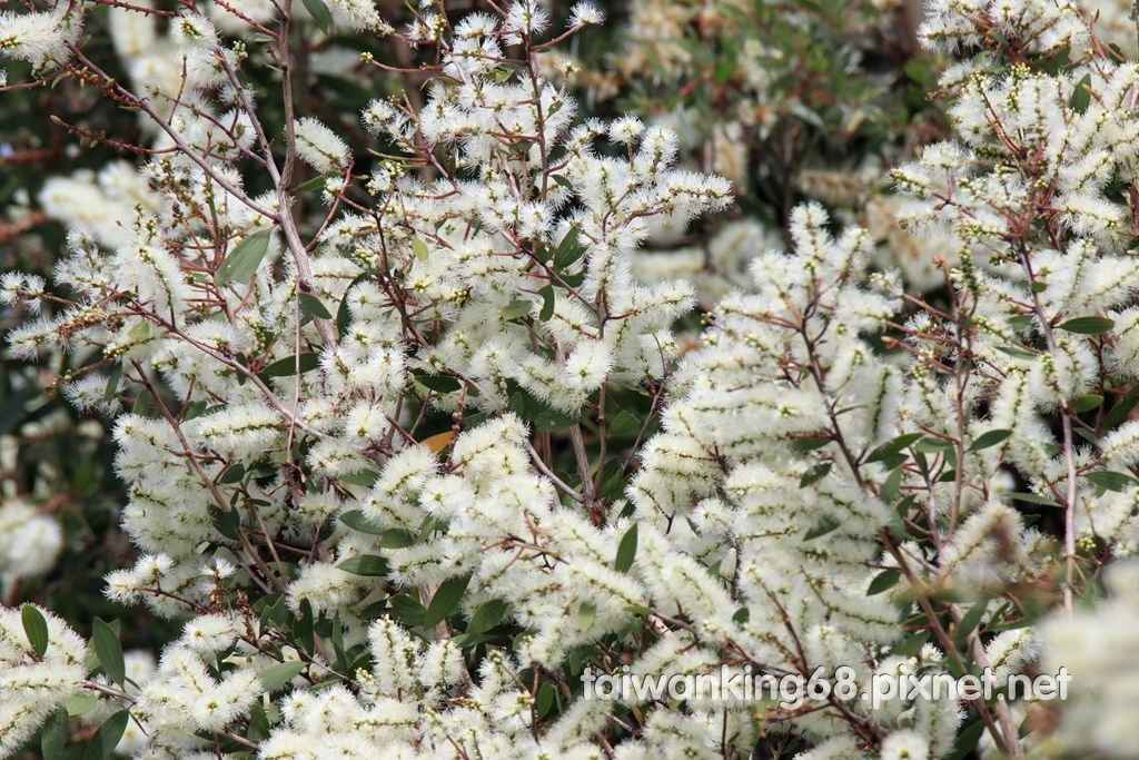 台灣四月份開白色花朵的樹木,除了流蘇和桐花外還有澳洲茶樹(↑)