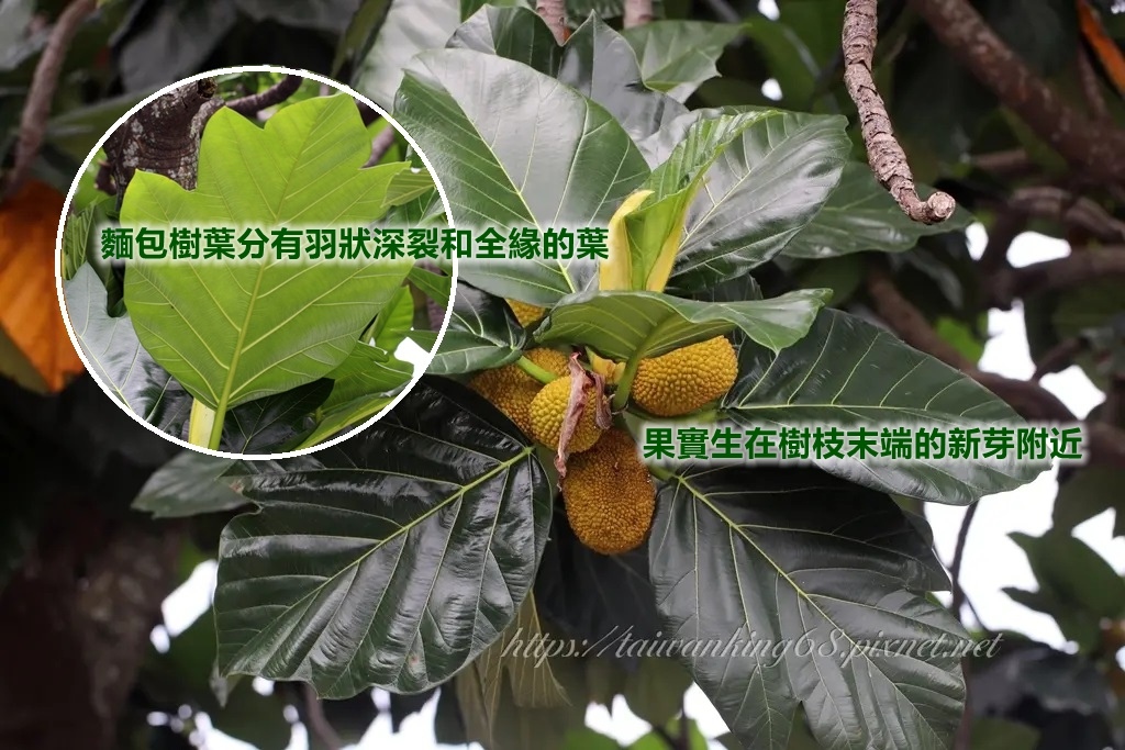 麵包果的葉片大如扇子,「麵包果」生在樹枝末端的新芽附近(↑)