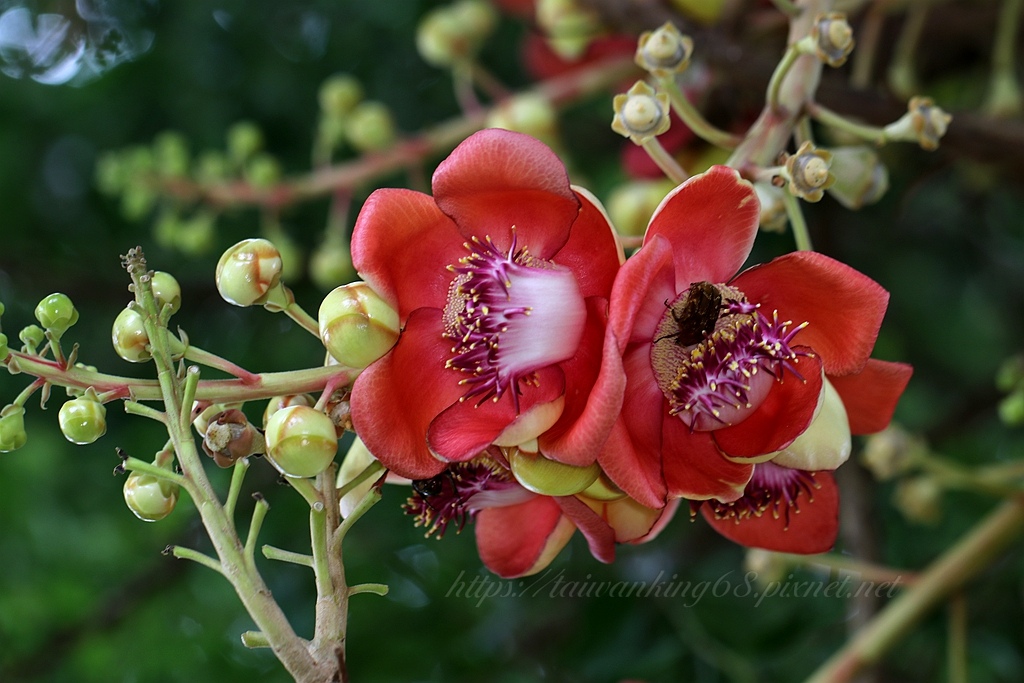 台中市豐原慈濟公園種植有廿多棵砲彈樹,目前皆已進入開花期,砲彈樹最特別的地方就是從樹幹開出成串的花朵,花色鮮紅有如煙火般,成熟的果實又一顆顆掛滿筆挺的樹幹,相當奇特和壯觀。