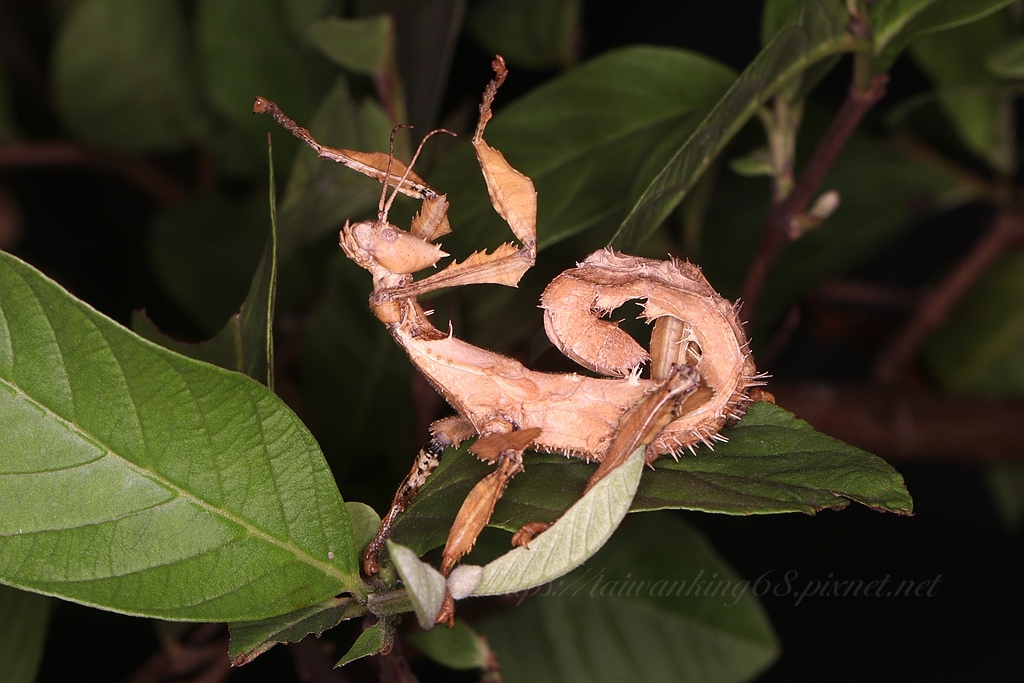 幽靈竹節蟲身體布滿尖刺,足部和腹部兩側有延伸的薄片,模仿枯葉(↑)