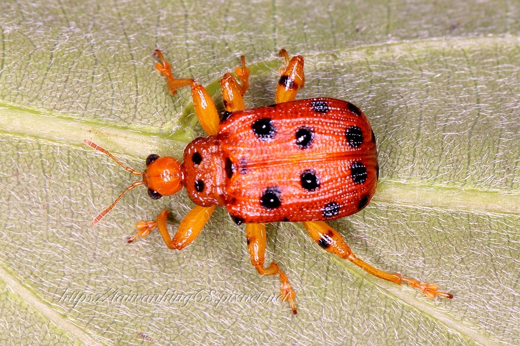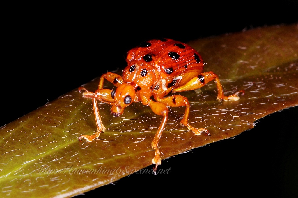 上圖這隻昆蟲單看牠們獨特的外觀就知道是「黑點捲葉象鼻蟲」(↑)