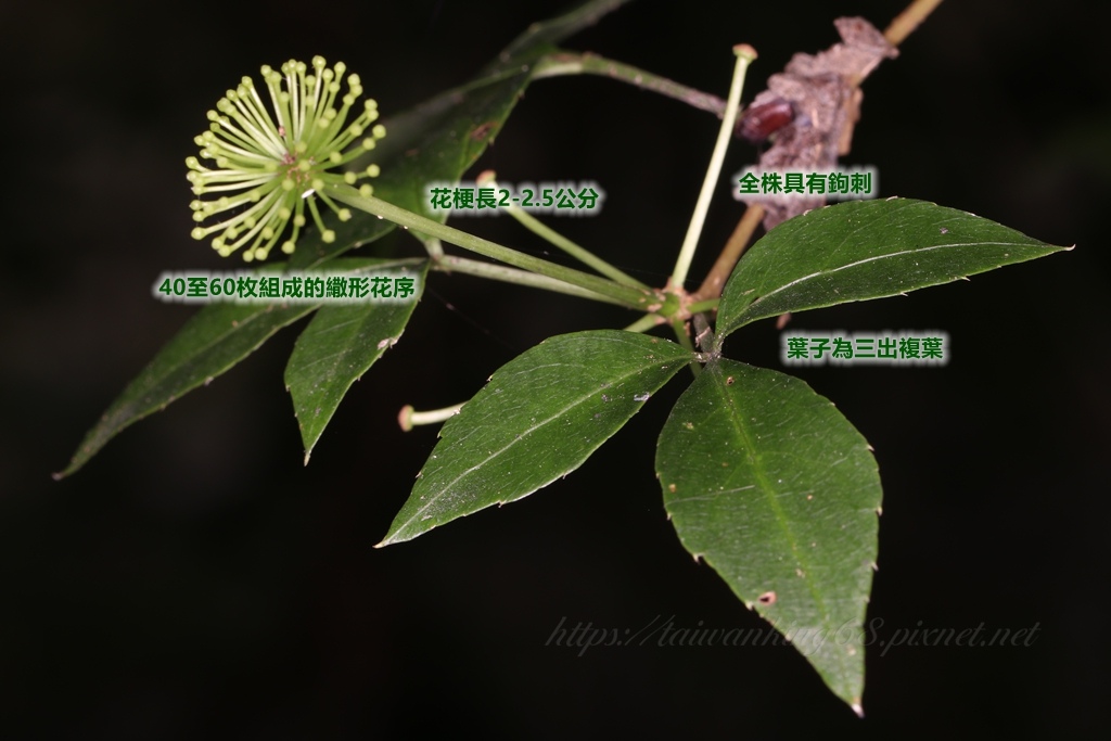 三葉五加的葉脈和葉緣帶有剛毛,且全株莖條都帶有「倒鉤刺」(↑)